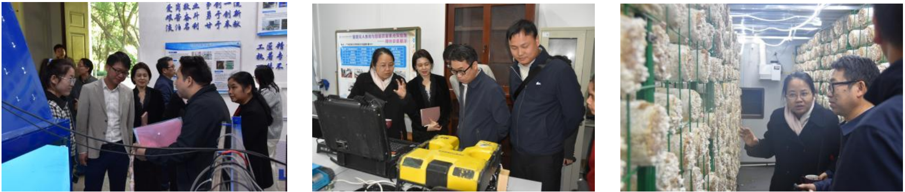 座谈结束后,调研团队实地参观了我院智能甘蔗切割机、水下航行器以及智能蘑菇方舱等项目。相关教师现场讲解了各个项目的研发历程、技术优势与推广应用情况,并重点介绍了其在助力农业现代化方面的实际成效。