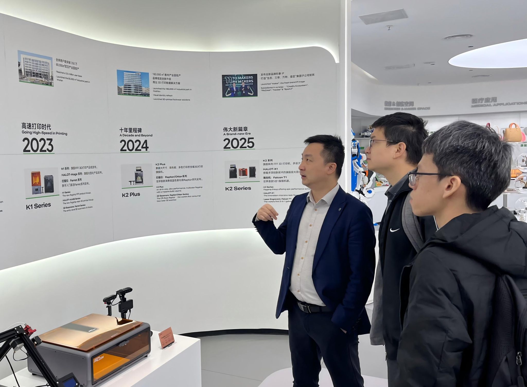 在为期两天的行程中,团队先后走访多家高科技企业,就人才培养、科研合作及学生就业等进行深入交流。首站,团队到访深圳市创想三维科技股份有限公司,华南大区负责人、大中华区教育行业总监洪鑫城予以热情接待。洪总监表示,企业高度重视与高校的协同育人,期待在创新创业、教育教学与实习实践方面开展深度合作,共同推进创新创业教育改革,为学生提供多元化的实践平台,切实提升学生的创新与实践能力。