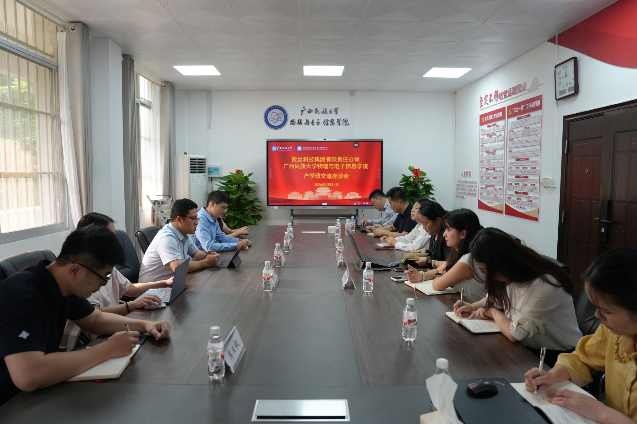 3月31日,南宁数丝科技集团有限公司副总经理施宁一行到访广西民族大学物理与电子信息学院,围绕智能传感、机器人系统集成与产学研合作开展深入交流。物理与电子信息学院院长李云、光电系主任杨蕾蕾、实验室主任覃晓及专任教师代表参加座谈。