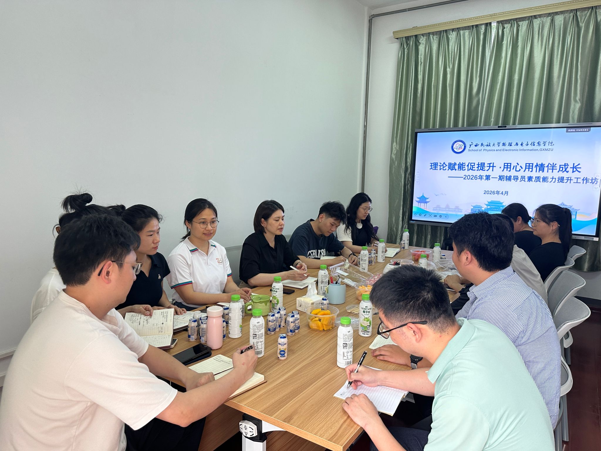 为进一步加强辅导员队伍专业化、职业化建设,提升思政教育工作质量,4月7日,物理与电子信息学院在博识楼224会议室举办2026年第一期辅导员素质能力提升工作坊。本次工作坊由学院党委副书记玉琳主持,全体辅导员参加。